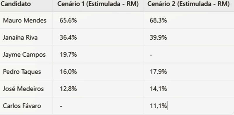 Na pesquisa estimulada (em que o eleitor pode citar dois nomes), Mendes alcança 65,6% das intenções de voto no Cenário 1 e 68,3% no Cenário 2. A Deputada Estadual Janaína Riva (MDB) aparece em segundo lugar, com 36,4% e 39,9%, respectivamente, consolidando-se como a principal concorrente.
