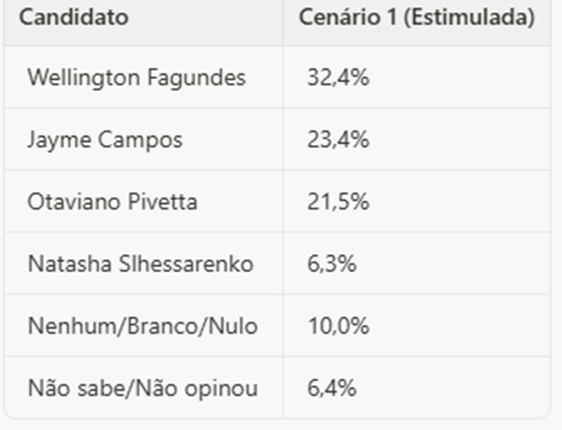 No Cenário 1, que inclui quatro candidatos, Fagundes atinge 32,4% das intenções de voto, seguido por Jayme Campos (União Brasil) com 23,4% e Otaviano Pivetta (Republicanos) com 21,5%. Natasha Slhessarenko (PSB) aparece com 6,3%.